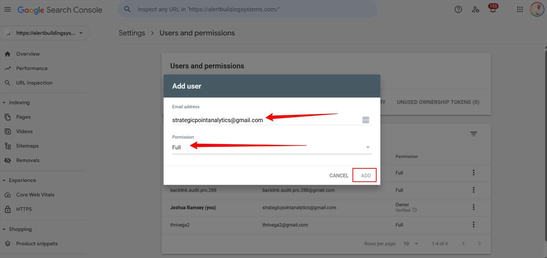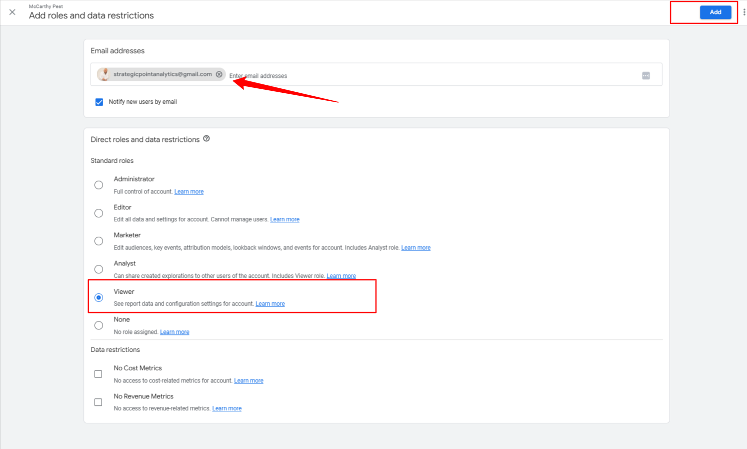 In the Add User window that pops up, enter the email address( strategicpointanalytics@gmail.com ) for the person you need to add in the email field, and select the appropriate permissions level. Then click the Add button to complete the process.