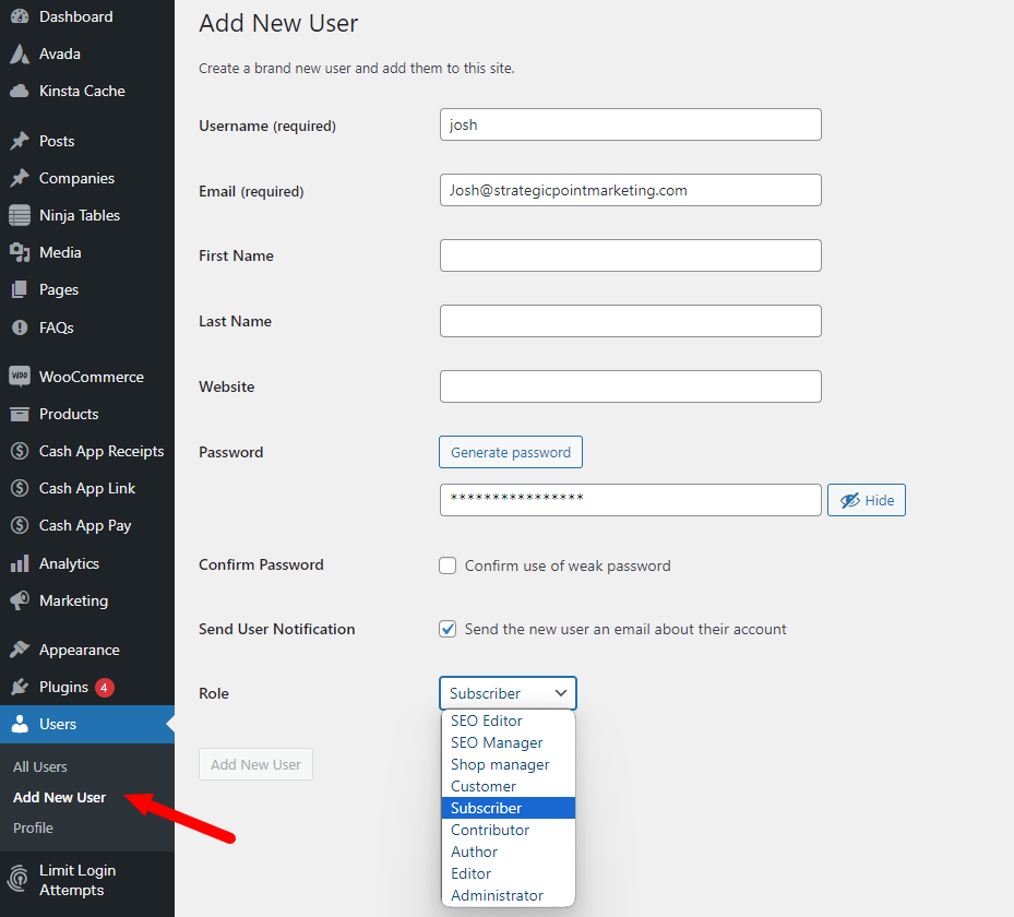 In the Add User window that pops up, enter the email address( strategicpointanalytics@gmail.com ) for the person you need to add in the email field, and select the appropriate permissions level. Then click the Add button to complete the process.